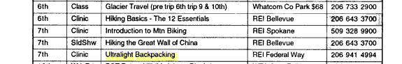However, again referring to the Usenet group above and older print sources, the term “ultralight” backpacking system is not that new. I found a reference to a 1994 Ultralight workshop at REI from a newsletter: