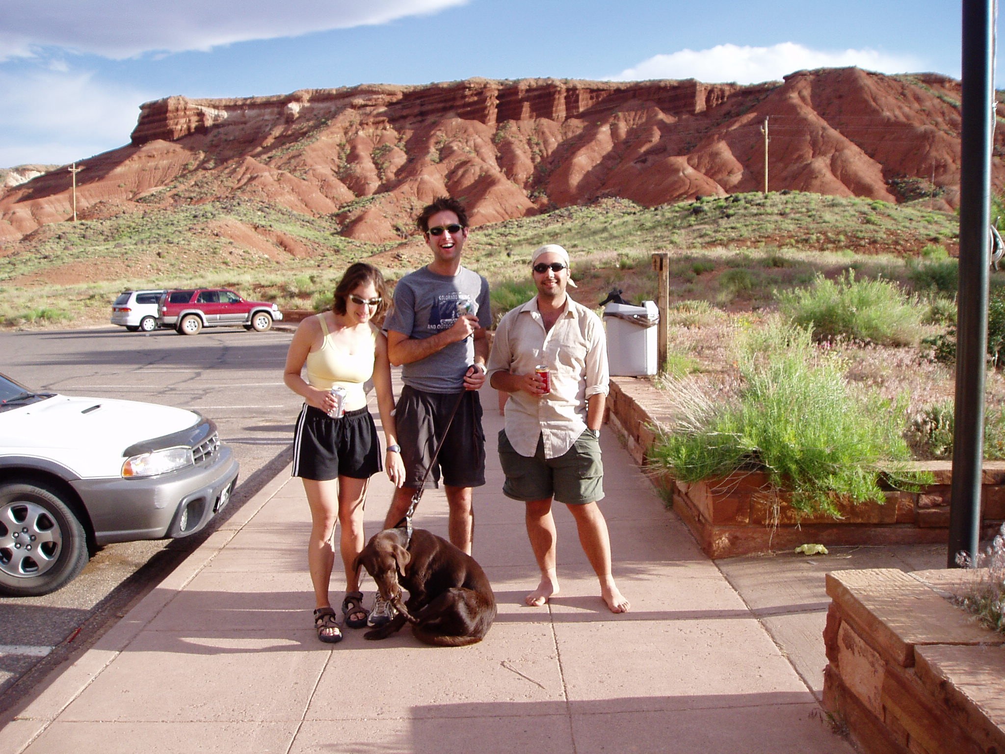 Marni, Josh, and I making a water and restroom pitstop in the Capitol Reef Visitors Center back in 2005. Traveler was a good dog! Pictured is the Subaru I spent much time in pre-Avery and Elijah. 🙂