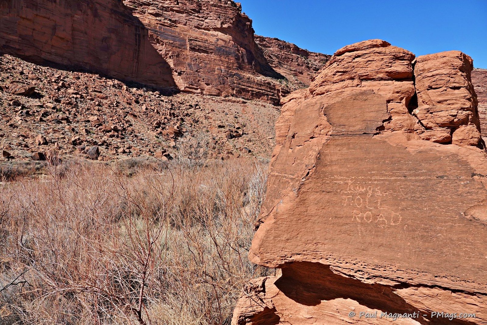 “Access between Moab and Castle Valley was originally via a pack trail called the Heavenly Stairway. This trail, named for a dramatic descent of over 1,000 feet was described as beautiful, but difficult to navigate. Isolated from Utah’s population centers, this area depended on Grand Junction and other cities in Colorado for supplies and a market for agricultural products. Moab residents pushed for a road to be built along the riverbank. By 1902, the trail was replaced with a toll road, called King’s Toll Road, after Samuel King. King was the operator of the toll ferry used prior to the construction of the Dewey Bridge. Rocks inscribed with “Kings Toll Road” can still be found along the roadway. While the road improved travel, it was not built high enough above the river level and was often flooded.”