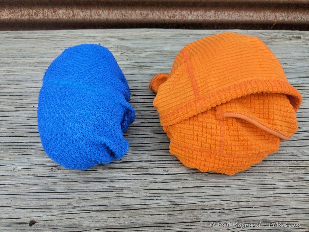 Squak Mountain Alpha UL Fleece next to their grid fleece hoodie.