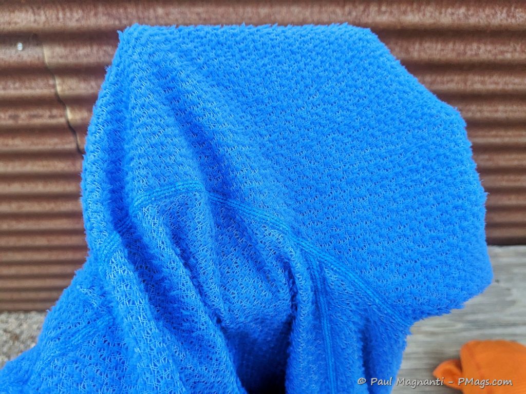 The garment comes in unisex sizing. Per the company’s advice, I sized up to a large weighing ~4.8oz / 136g. The lack of a pocket fits the practical bent of the hoodie and assists in trimming weight, too. There are thumb holes on the sleeve to make a closer fit (I am not a fan of thumb holes overall, but that’s a personal preference.)