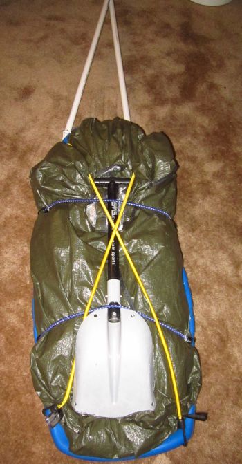 Same design but using the Jet Sled. I left one bungee cord at home; otherwise, the “burrito” would have been tighter!
