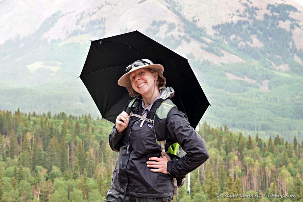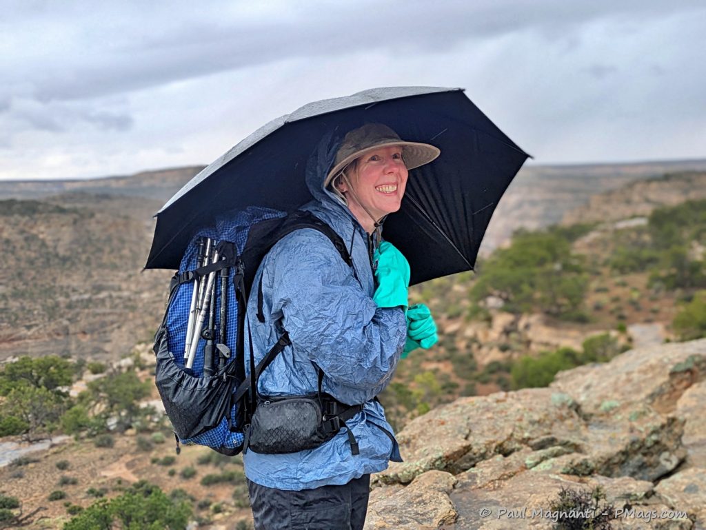 Joan is a fan of hiking with an umbrella—excellent protection on breaks and just in general. The trade-off is that umbrellas don’t do great off-trail or in overgrown terrain, but when they work, the versatility is hard to beat. It’s a key part of sun protection for Joan as well.