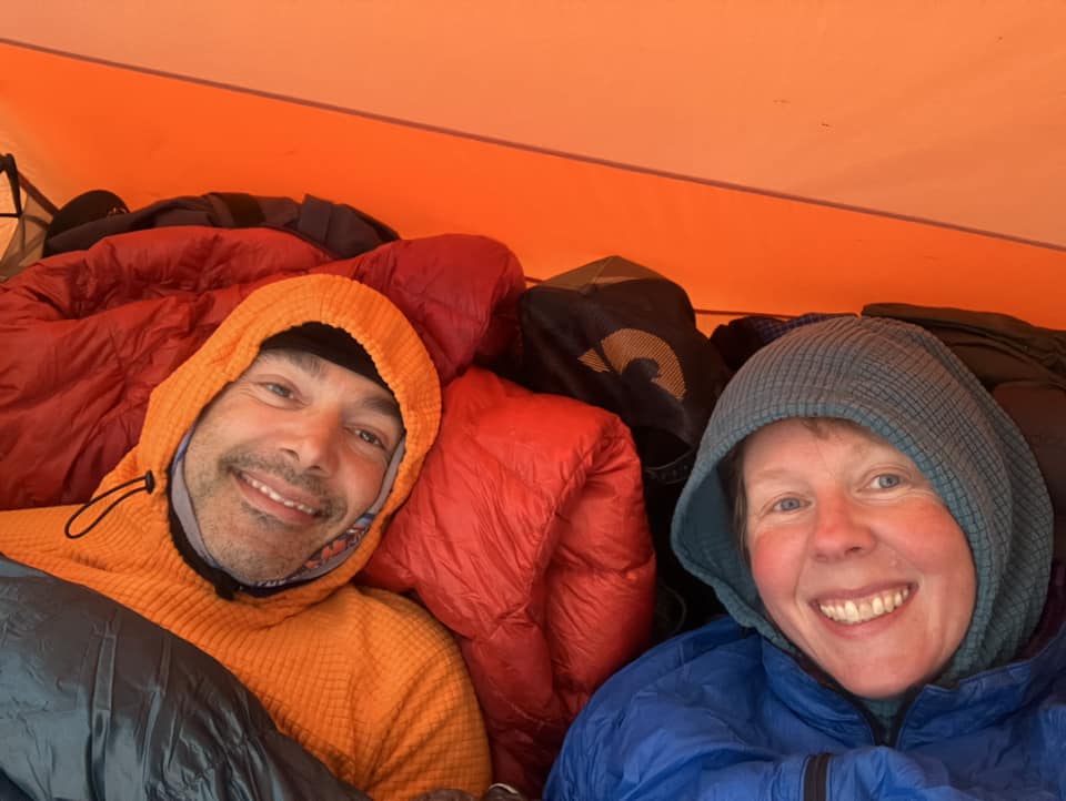 Joan and I have had a good experience with a Copper Spur HV tent for these cold and wet conditions. Split between us, it’s a manageable 2 lbs / 1kg for me and 1 lb / 500 gr for Joan. The double wall shelter helps (but not completely) mitigate condensation, keeping our quilts dry, and keeps in the warmth better for us as well.