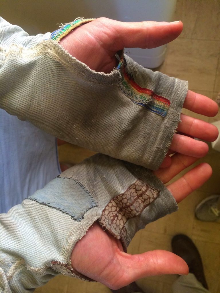 Having gloves and mittens is essential, but that alone doesn’t do enough because the blood flow still has to make it out all the way to my fingers and toes. So, I wear DIY “wristies” or what runners call “sleeves” to keep my wrists and lower arms warm, especially where the veins are close to the skin. I sew my own wristies, which are like sun gloves, only made with an old Capilene base layer shirt so they are warmer and mitten-style, keeping my fingers warmer together.
