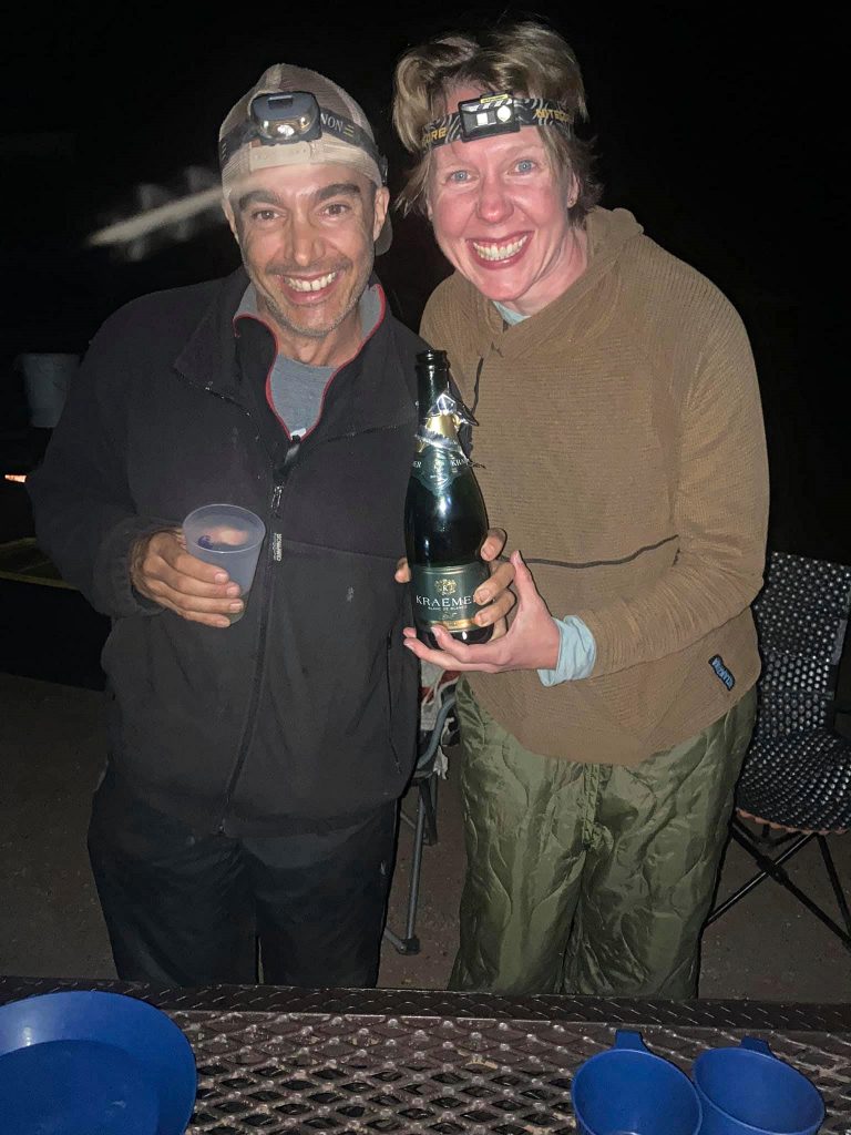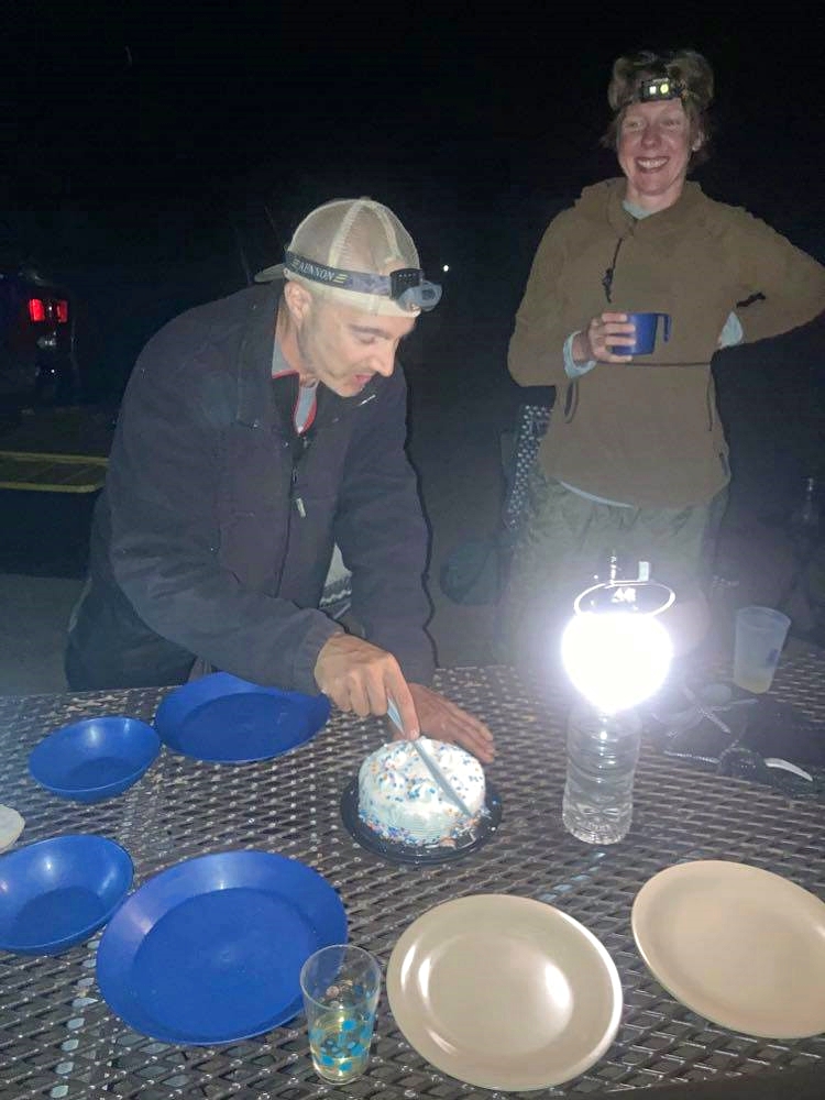 After this hike, we made it back to our site, and Judy joined us and surprised Joan and me with an impromptu backcountry wedding reception with cake and champagne!