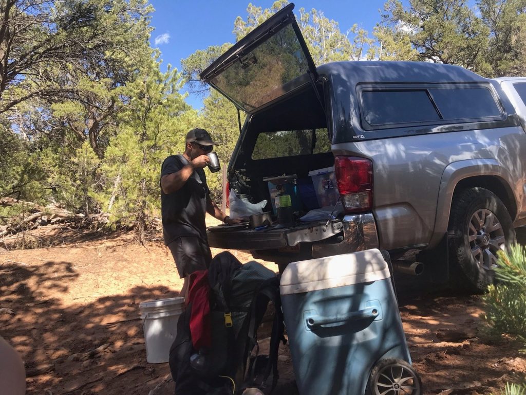We arrived at the truck and enjoyed a catered lunch at the trailhead. And by catered, I mean reheated leftovers from home, in the cooler, with a last-minute batch of coffee for me.