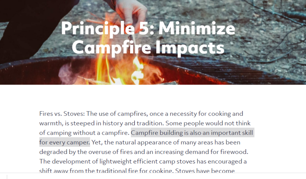 Leave No Trace desperately needs to update Principle #5 of “Minimize campfire impacts.” Arguably campfires by their nature, and backcountry ones, in particular, do leave a trace – Gathering wood, moving rocks, charring the ground, smoke, disrupting the experience for others, etc., be it for humans or the local wildlife residents.
