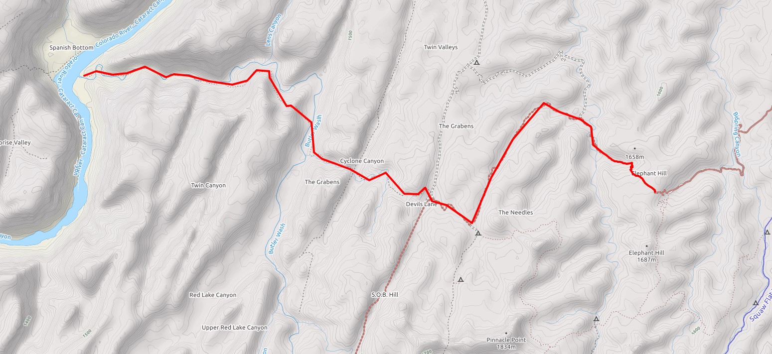 - Of you can go in via packraft in various ways. We opted to go in via Spanish Bottom via the Lower Red Lake Canyon Trail as it is quicker and logistically easier. Since we were floating across, and not traveling on the river for any length, more accessible that way too. Once across, we hiked the visible and maintained trail on the other side of Spanish Bottom up to The Doll House to get into The Maze proper.