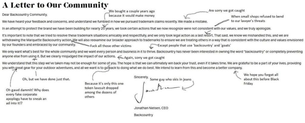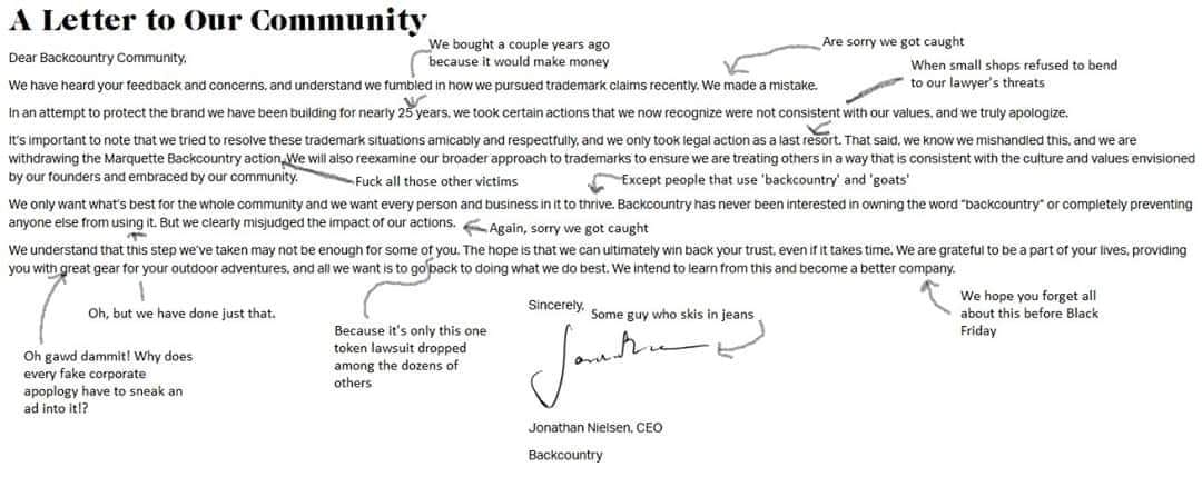 - Backcountry.com angers more than a few of its customers as it sues small companies, but not large ones, with the word “Backcountry” in it. And then makes a half-hearted apology.