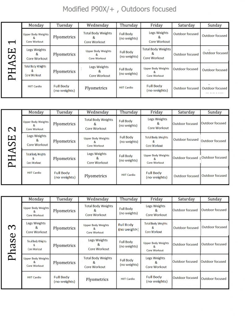 I’ve been using a modified classic P90X schedule combined with more of the overall muscle-group workout style of P90X+ with outdoor activity on weekends. I take rest days as needed or I ratchet down what I do on a weekend. In lieu of yoga, I’ve been using Coach Ali’s Full Body (no weight) workouts that combine ~15-20 minutes each of bodyweight exercises, core workouts, and HIIT cardio in a ~45-60 minute session. Additionally, I’ve been adding his 6-pack ab workout series in rotation coupled with one of his dumbbell routines as appropriate to make a full one-hour workout. My plyo day alternates with the old-school P90X plyo and this one I’ve particularly enjoyed. I’ll add a 45-60 minute HIIT cardio routine as an adjunct on the rare weekend home or during the recovery week.