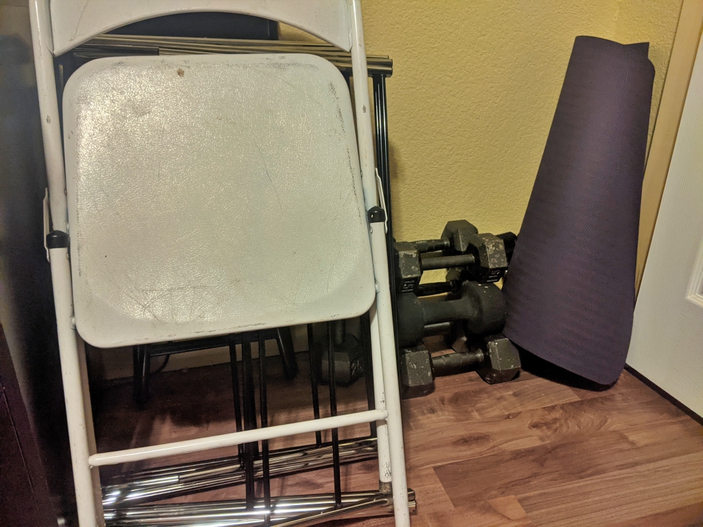 - We don’t have room for a weight bench, but a folding chair works well for dips, doing curls, and other exercises. It stores easily when you finish. Probably one at the thrift store for $5. Even new, they aren’t terribly expensive. BONUS: If you are, say, oh, 5’6″, you can easily retrieve things on the high shelf!