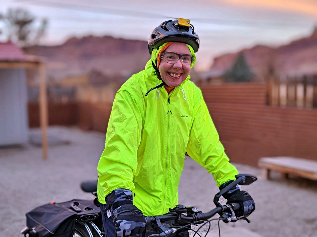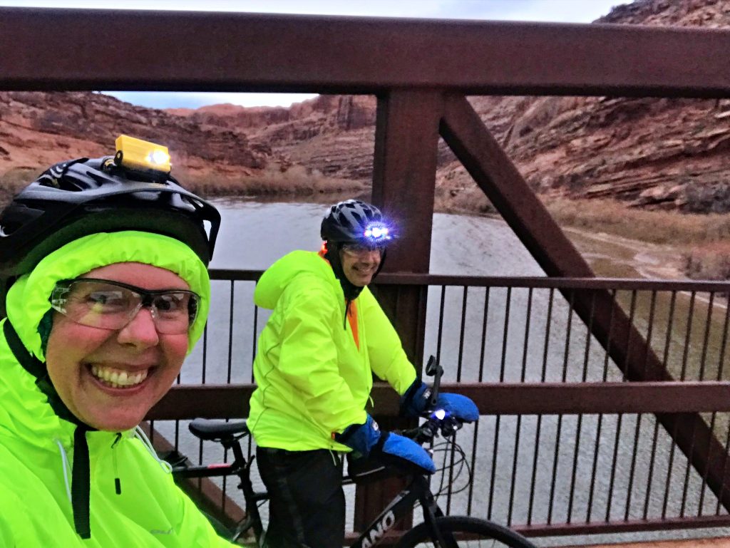 I joined Joan on a bike ride from Arches one early December evening. Joan enjoys the “twinsies” look, me not so much!!! 🙂