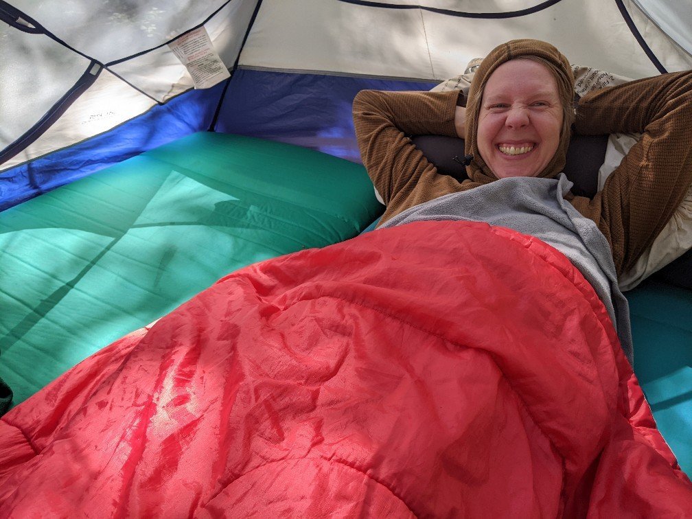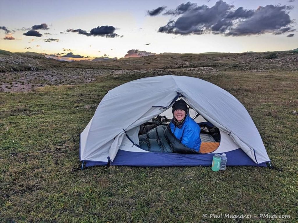 We’ve repeatedly stayed dry and warm in torrential and windy downpours. While not as tall as a car camping tent, it is tall enough that we can sit up comfortably if we find ourselves in the tent for an extended time.