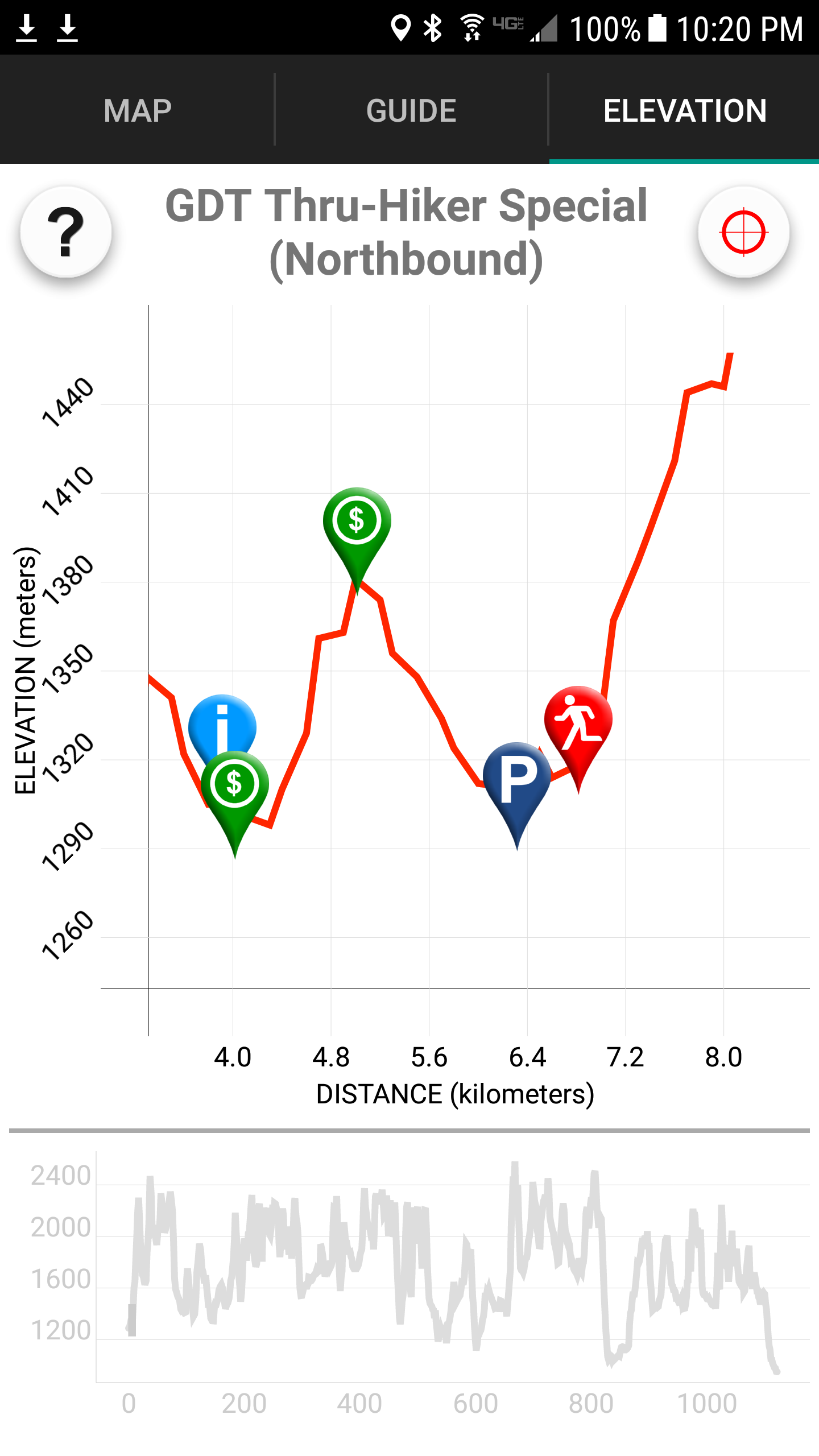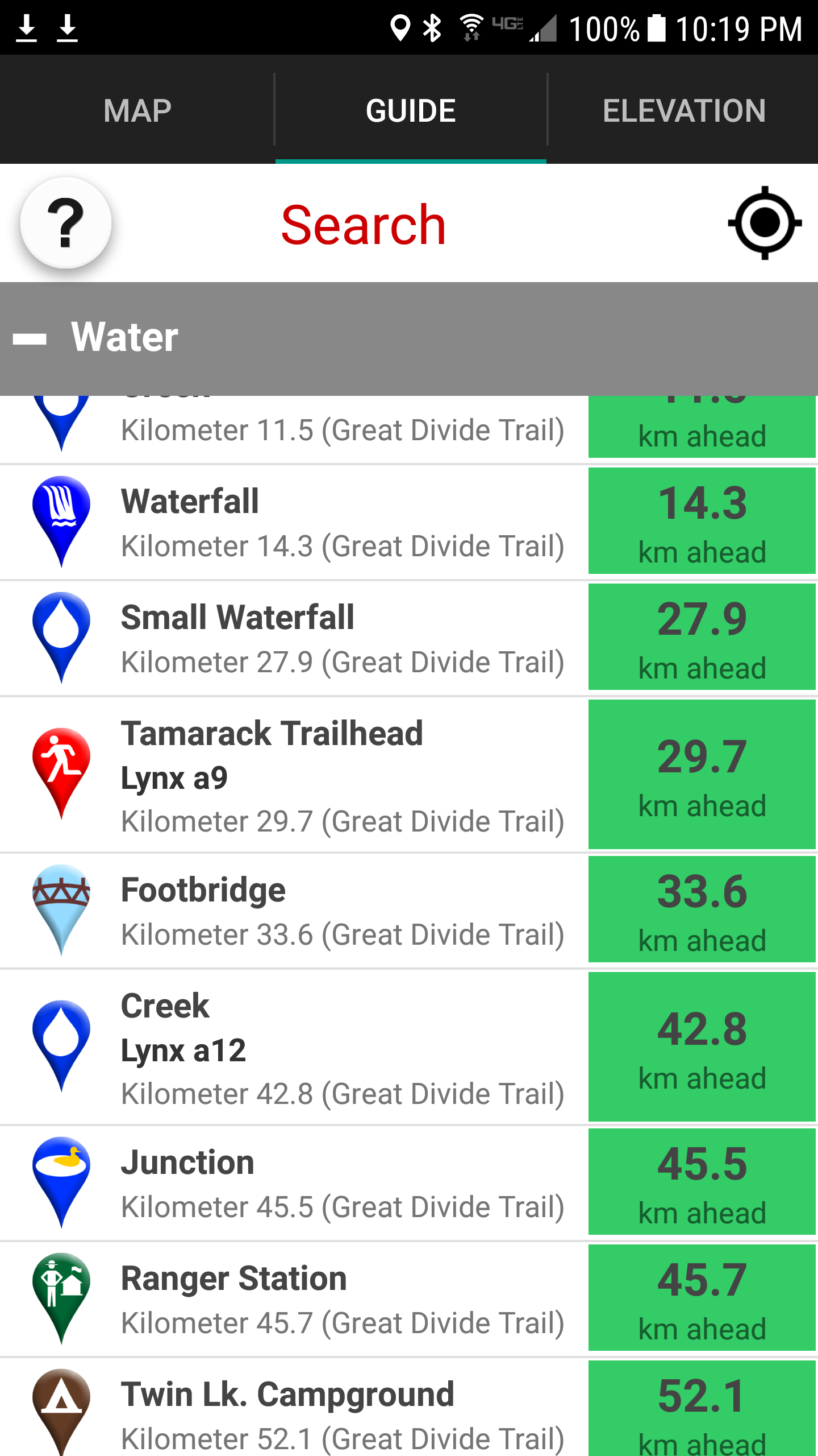 The features I found unexpectedly useful are the built-in guidebook like features. Based on the distance from GDT guidebooks and other sources, such info as water, potential campsites, and other features are listed in a traditional trail specific databook-like form.