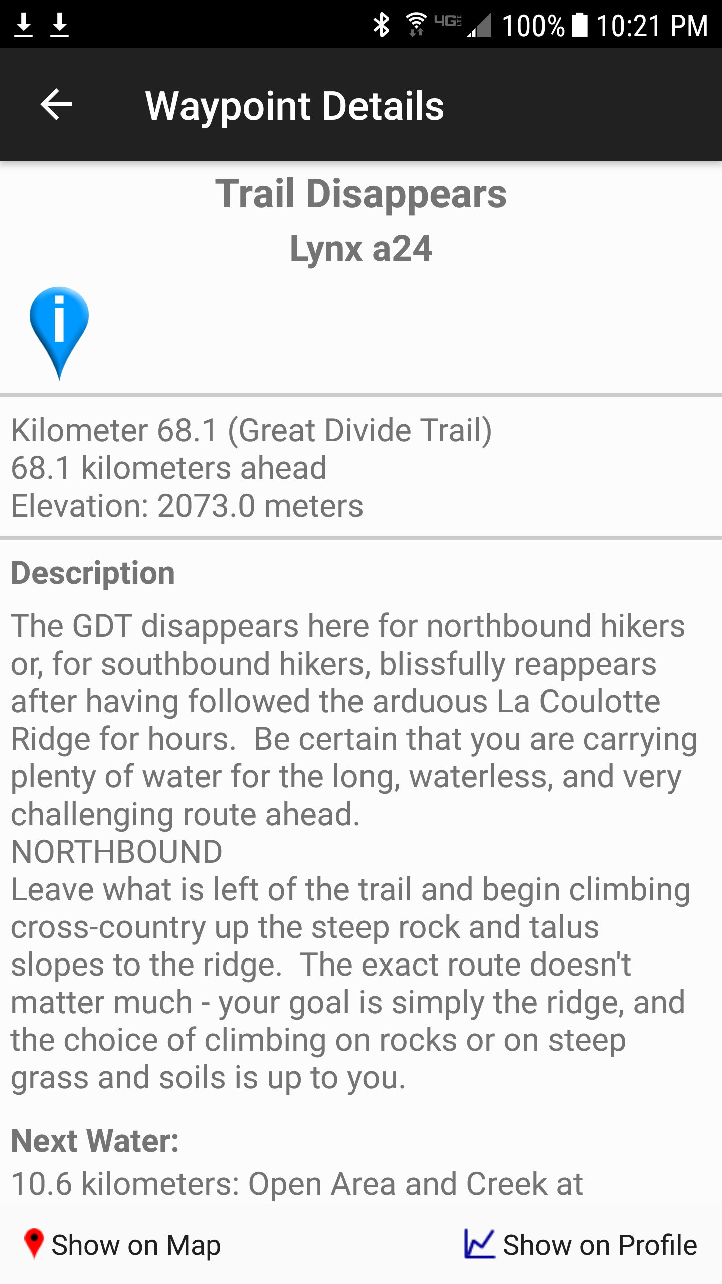 Which brings up another point, the app complements and does not supplement, traditional map and compass use. Electronics can fail, “things” happen, and the GDT, in particular, is not a trail to just blindly follow a GPS track.