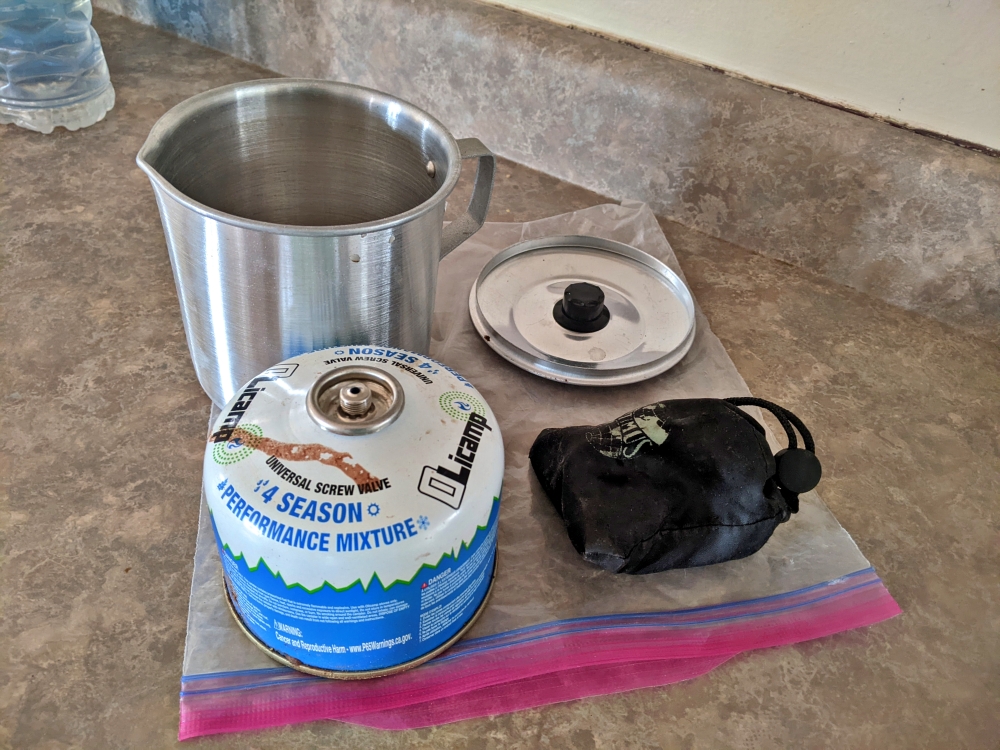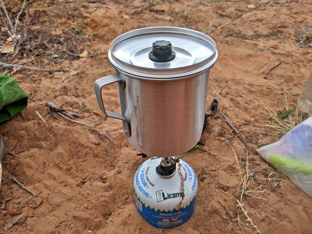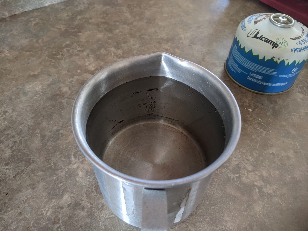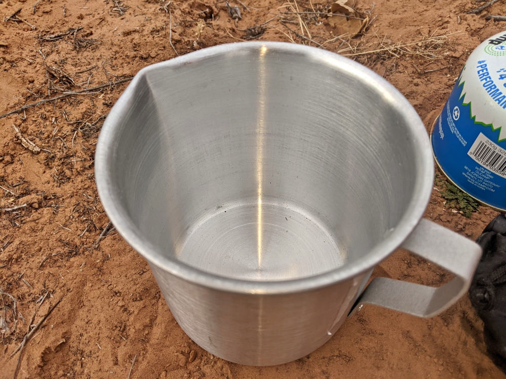 Overall: The Bene Casa grease pot makes an excellent cookpot for two. Aluminum may dent easier than titanium, but it conducts heat better, and at $10 and 5 oz, it’s a great deal that happens to work well. We’ll use this pot for years or until Joan tells me to replace it. 😉