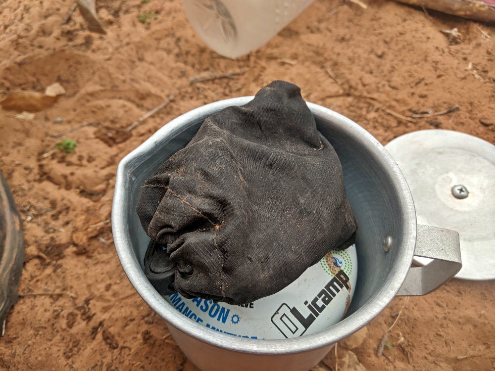 However, where this pot works fine for solo use during colder weather or larger thru-hiker-style meals, it is not as adequate for decanting water into a water bottle as quickly. My bandanna scrap did not work well with the full two-person pot vs. enough water for personal use.