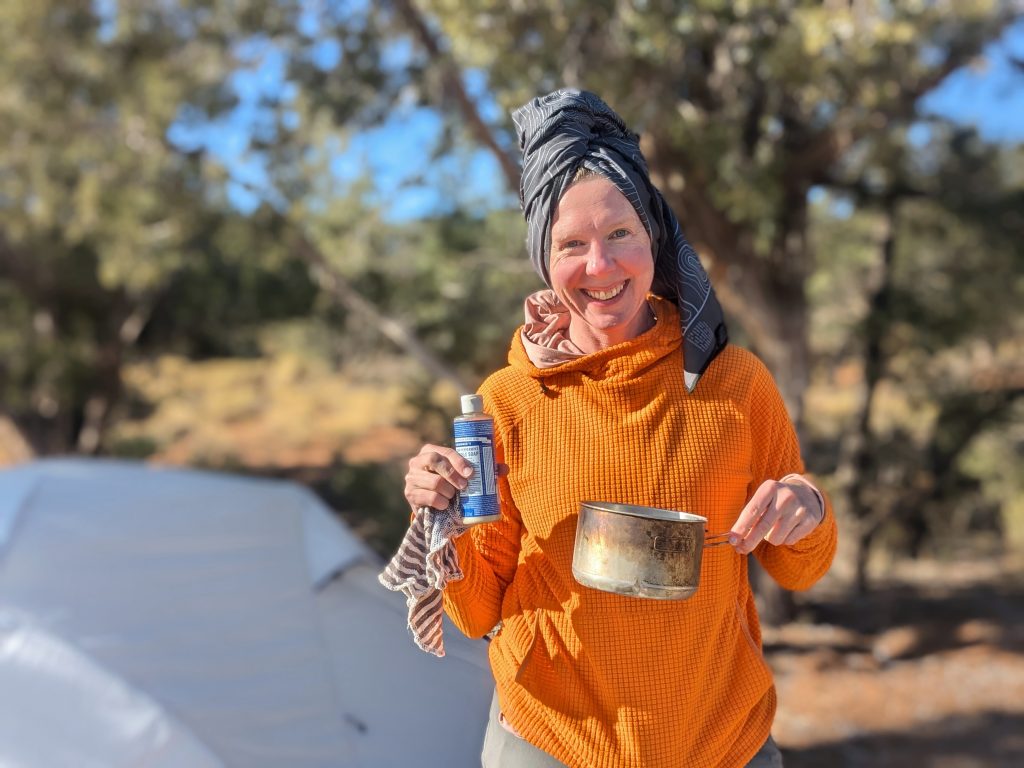 We’ll heat hot water, grab Dr B’s, and a washcloth to eliminate sweat, salt, and schmutz. We especially enjoy this bathing when we car camp between backpacking trips such as extended trips.