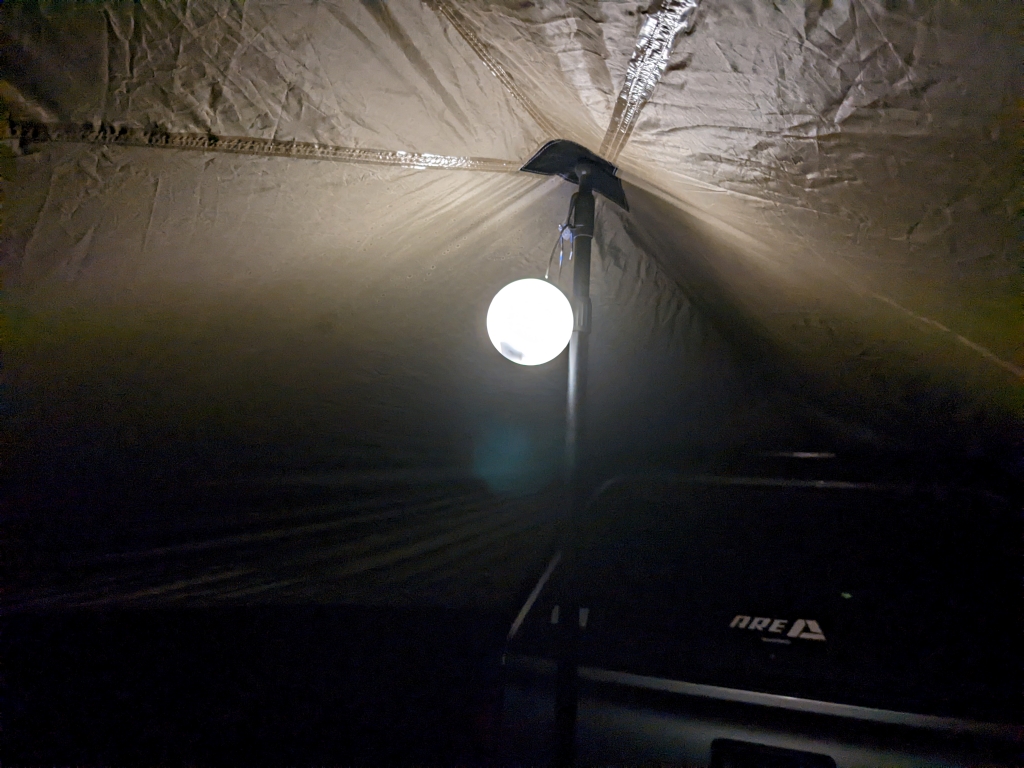 UPDATE JAN 2022 – “In action” with the telescoping pole. The A-Frame style setup seems to give the most versatility for our needs in inclement weather.