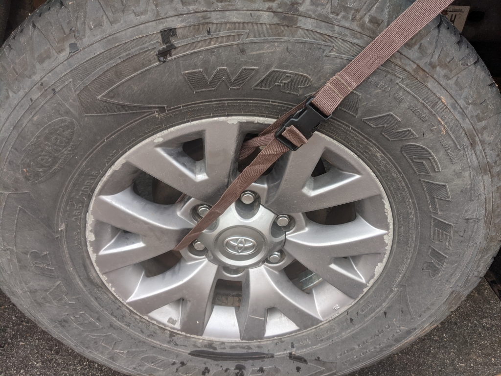 The back of the tarp has reinforced fabric to hold the liftgate in place, and the strap themselves easily setup in the wheel rims and tighten down quickly: