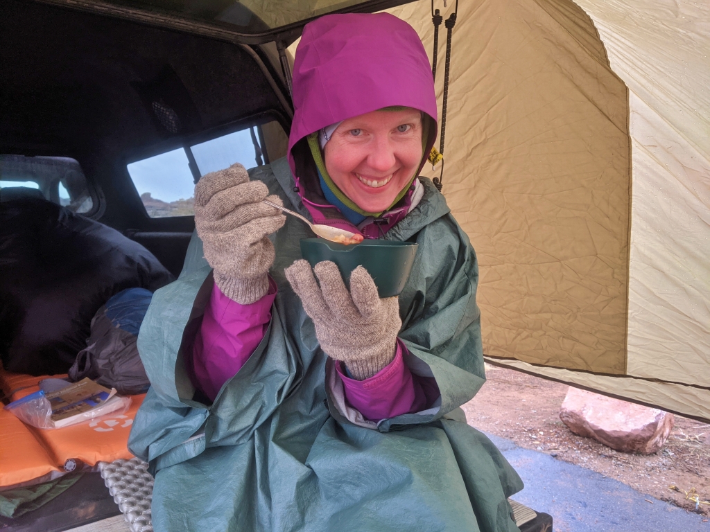 We set it up backpacker style with a smaller pole and low to the ground for the rain, sleet, and late-night snow we faced this past weekend: