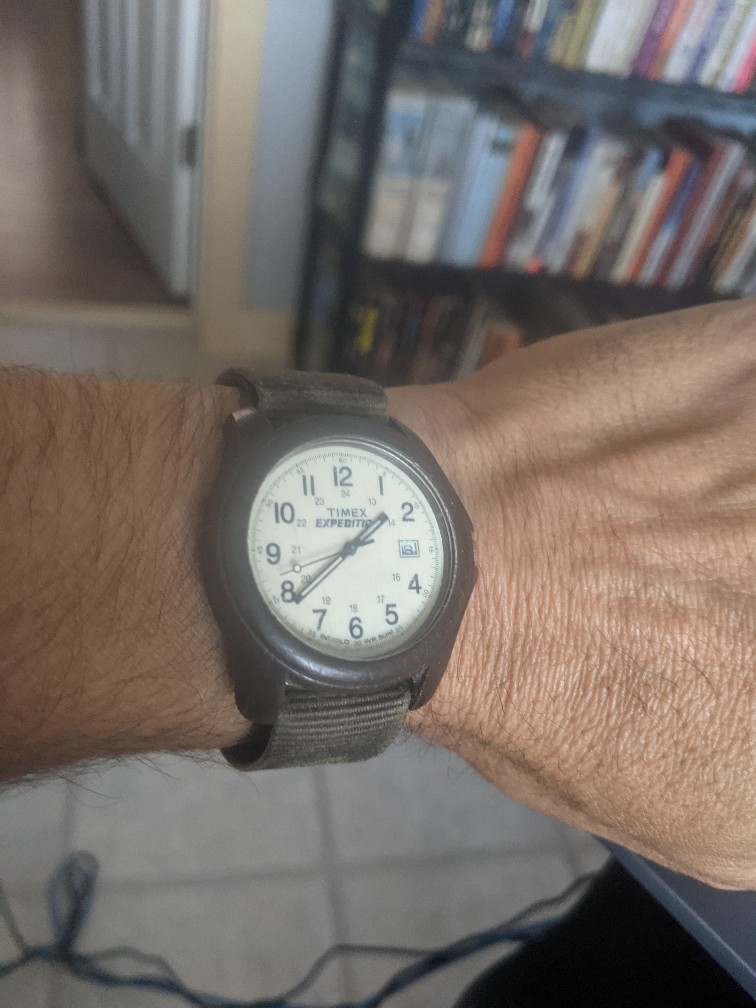 So the watch of my choice? My trusty Timex Expedition Indiglo. It tells the time. It tells the date. It glows . It is weather resistant. It is analog and does not look like an artifact from a 1950s SciFi movie.