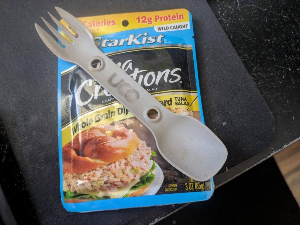 The design is straightforward: spoon on one end, fork on the other, with a slight serrated edge that doubles as a light-duty knife. It’s not going to slice hard cheese ike a traditional knife, but it’ll handle yogurt, pasta, leftovers, or a packet of tuna just fine. For typical trail or camp food, it gets the job done without fuss. Our major use case for this utensil is packing in leftovers for a day hike from home or some post-trail noshing after a weekend of backpacking. Or making a quick cup of joe on our tailgate before driving home.
