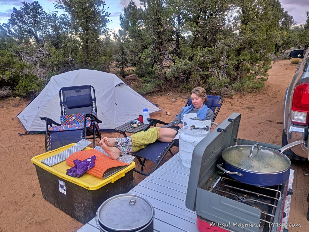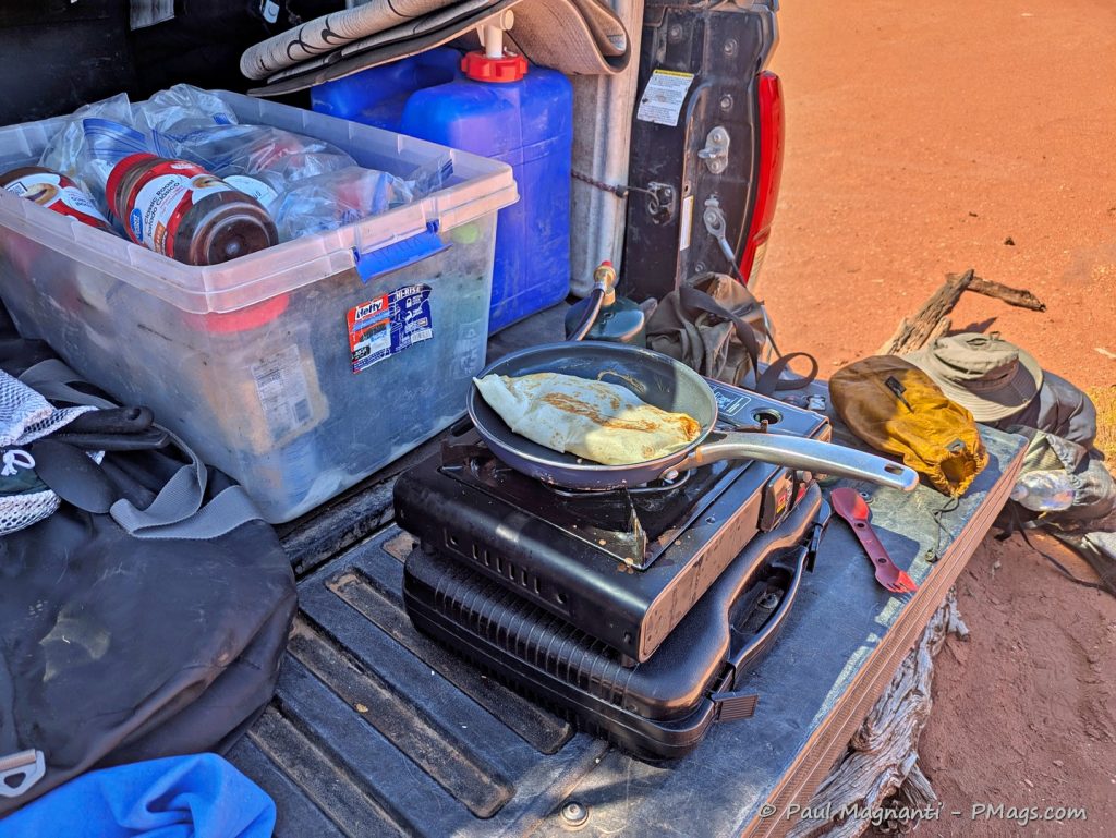 After a few too many bumps down dirt roads that scratched up our pan a bit too much, I bought a replacement pan for camping this year, and it quickly became Joan’s favorite. The Blue Diamond ceramic pan holds heat well and cooks evenly — always a good choice for camp stoves!