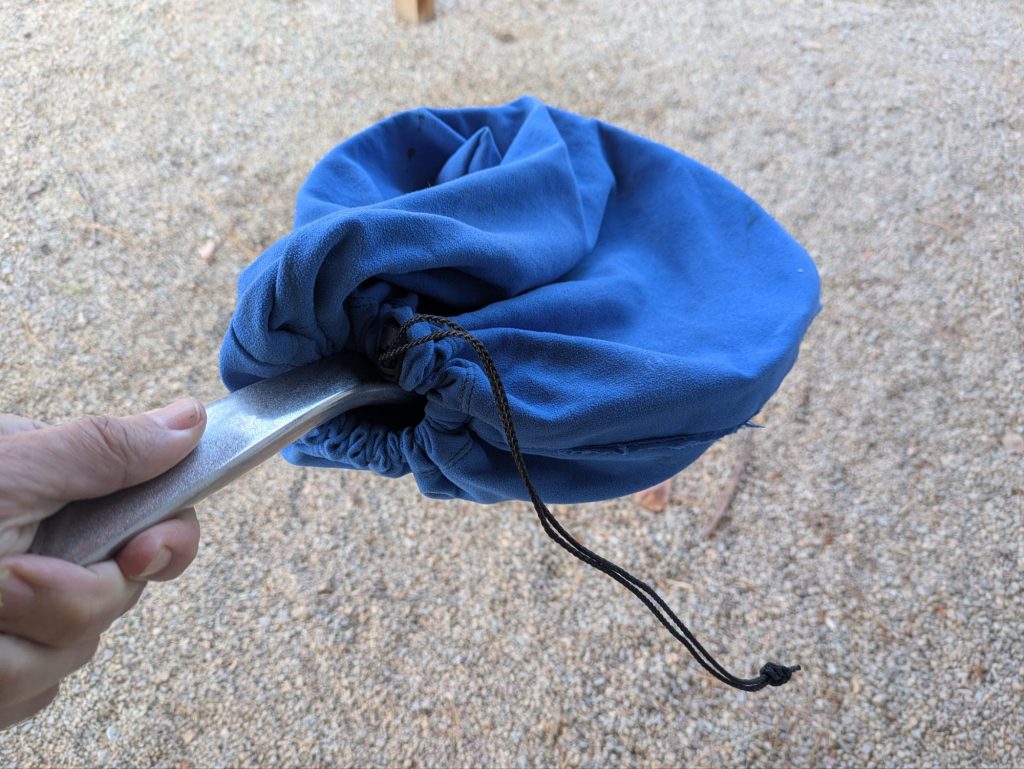 Joan, ever mindful of our gear and how to prolong its use, made some dual-use pan covers to both protect and dry the pans, using recycled camp towels, bankline, and cord locks, too.