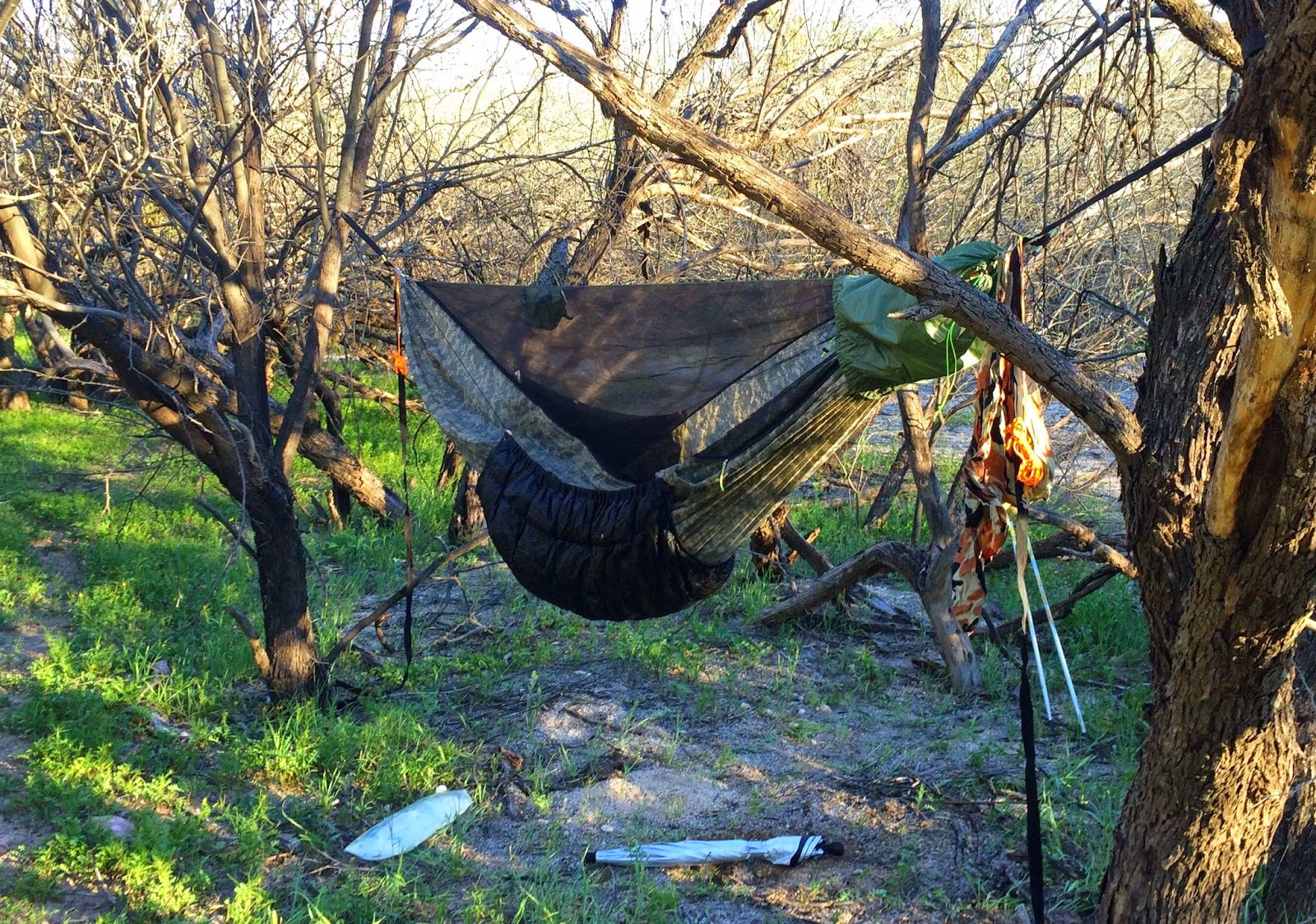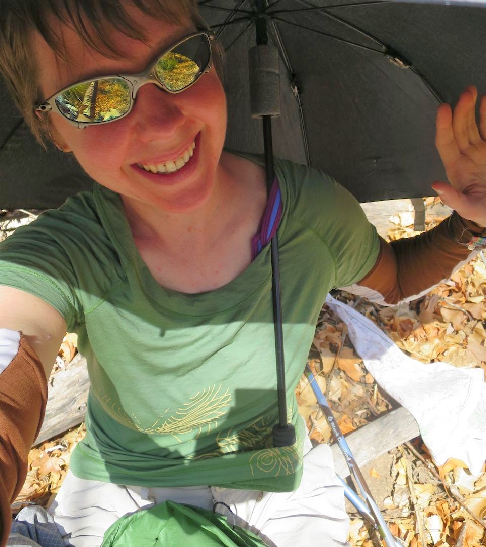 I also have a hands-free rigging method for when I’m not wearing the backpack. I use my bra strap and shirt bottom (folded over) as the two “attachment” points. It looks funny (especially with a purple bra), but it works when I can’t otherwise find a shady spot and want to have both hands free to eat.