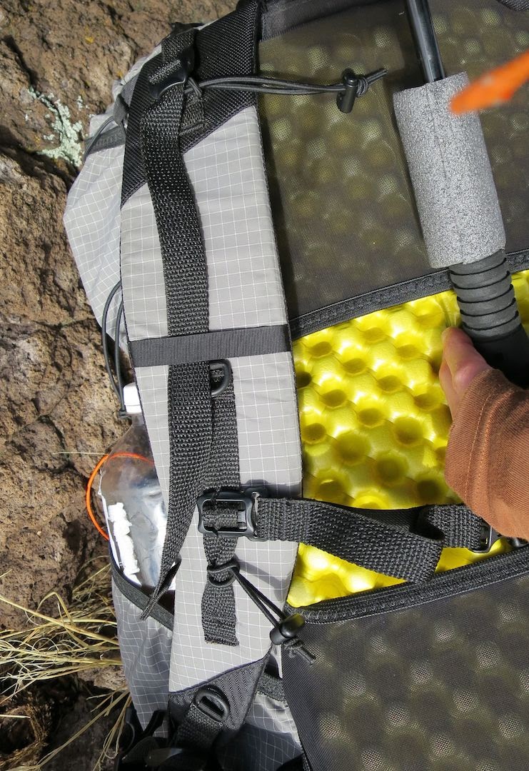 On my Gossamer Gear Mariposa pack, I like the upper loop at the base of the load lifter and the lower loops near the chest strap. Sometimes I attach the lower loop below the chest strap like shown in the previous photo, but other times I put the loop above the chest strap. I wish there was another loop below the load lifter for the upper loop through and may end up sewing one on eventually.