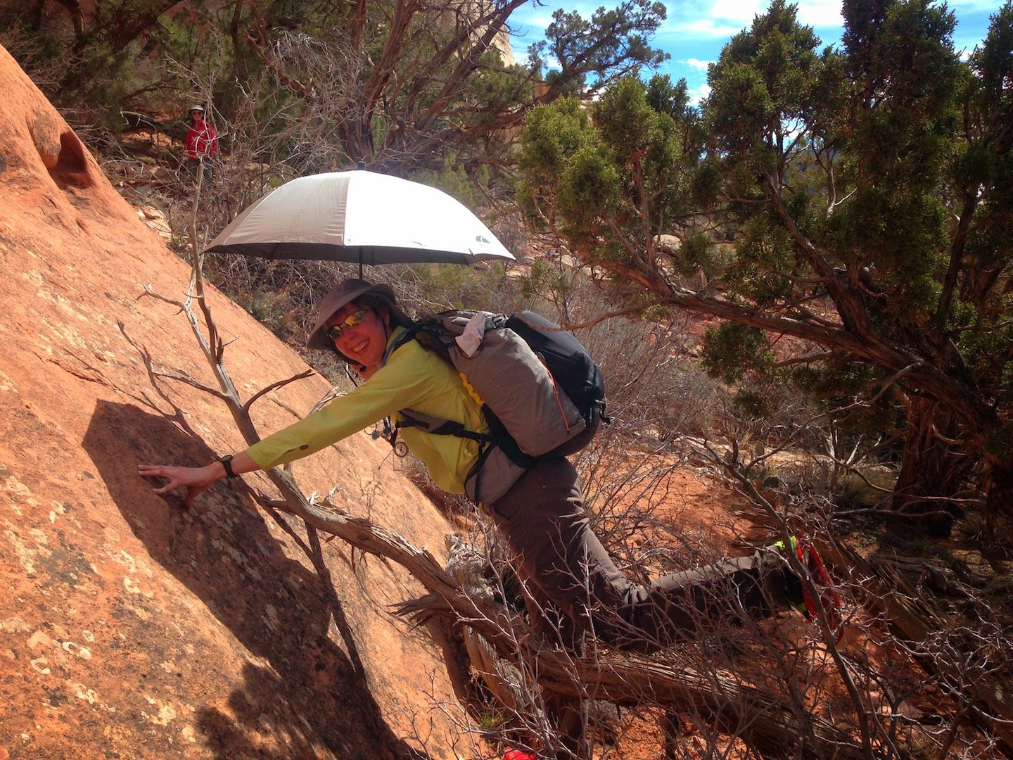 While I just described how I use the umbrella hands-free, I have found that over the years, I use the umbrella more frequently by carrying it with one hand and stowing one hiking pole in my pack. This method allows me to adjust the angle of the umbrella to keep more of the sun off me and so I can maneuver in overgrown trails. I use the hands-free rigging mostly on long downhills (where I like to use my poles). With a light umbrella, I find my arm does not tire even after prolonged use.