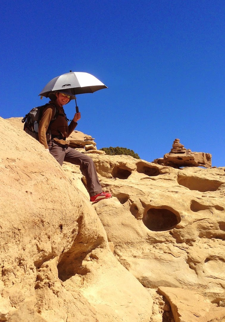 I can safely take a rest break under the protection of my umbrella. Plus my knees won’t get sunburned.