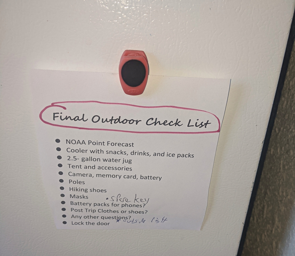 However, before we leave the door, we always look at one final list on our fridge. I am mainly prone to forget certain items (memory card for camera still in my laptop), or Joan will leave behind her hiking poles. And, of course, we like a reminder to bring certain items to increase versatility.