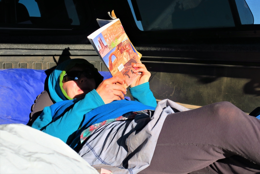A cold front moved in, and the wind picked up. Rather than futz with our tent, we opted to sack out in the camper shell of the truck. For an evening, the wind free and cozy oasis of our camper shell did the trick. And our first time using it in this way on our new-to-us truck.