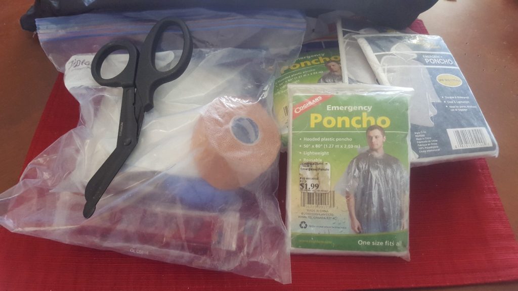 The guide kit includes safety shears, Lueko tape, Tylenol for those allergic to Vitamin I, nitrile exam gloves, an irrigator for cleaning abrasions, Immodium AD, triple antibiotic, a roll of gauze, and electrolyte “energy” gels or chews. I’ve used all these items at one point. Additionally, I carry emergency ponchos and Wag Bags for the clients for day hiking in the desert. I’ve never had to give out a Wag Bag, but I’ve used the ponchos for clients who do not expect precip in the desert.