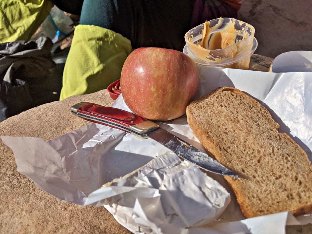With homemade rye bread, brie, and fruit while hiking in Canyons of the Ancients over Christmas.