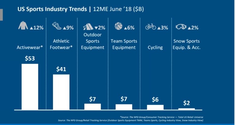 However, again going with the trend of less time and more money for an overall affluent, but overworked, group the sales of apparel and “lifestyle” clothing far outstrip hard good sales: