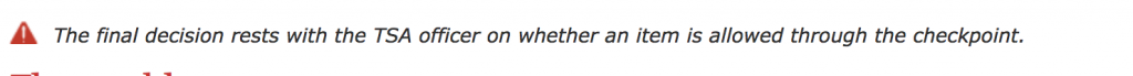 Translation: if a TSA agent isn’t familiar with every rule, or just wants to play it safe, they can still confiscate your item. And do you really want to risk a delayed flight, arguing with them?