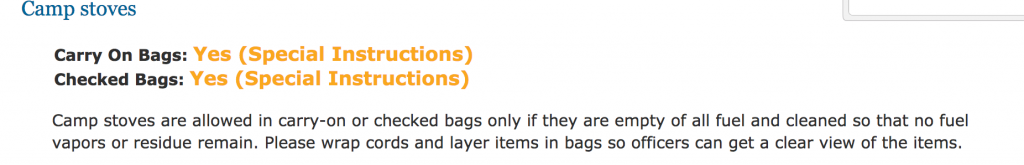 Although the TSA website has an extensive list of dos and don’ts, navigating all those regulations can be daunting. Individual airlines can be even stricter—camp stoves, for example, often get extra scrutiny. (And you can’t fly with fuel either!)