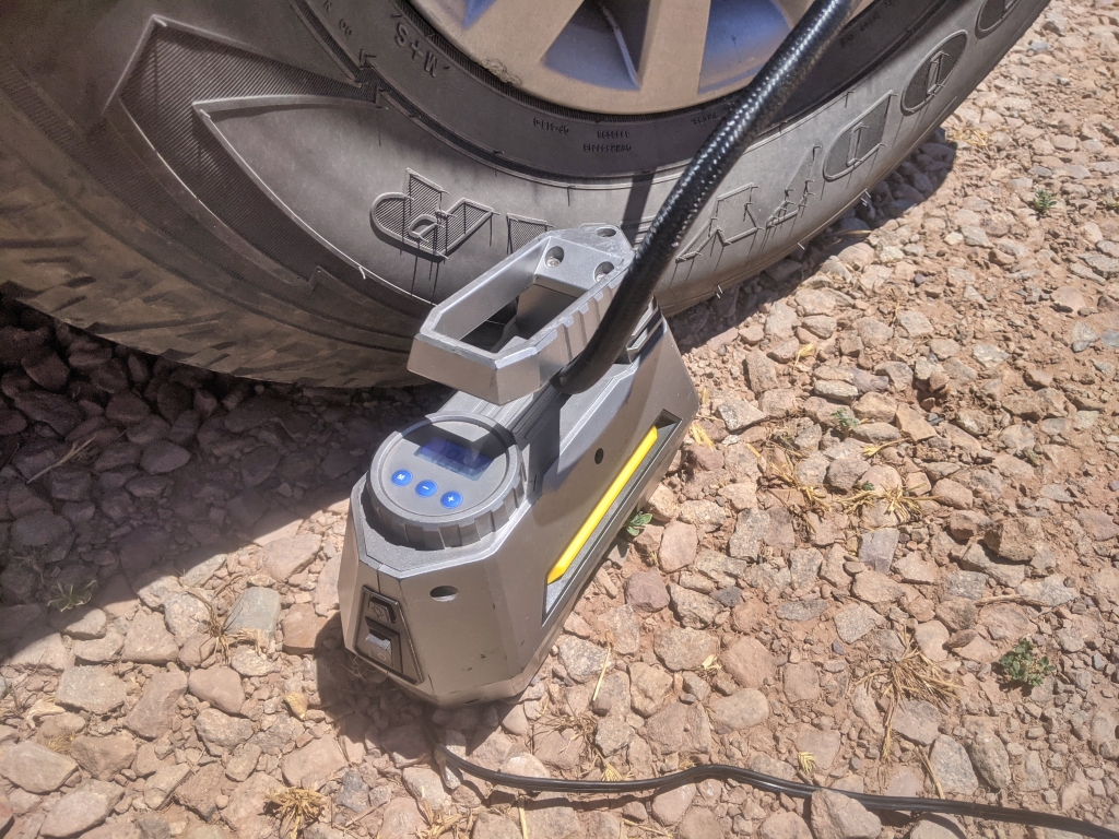 The utility of the air compressor became apparent again this weekend. When I arrived at our truck, the tire seemed low at a mountain pass at 10k ft at a dirt trailhead, not the most accessible place to swap in a spare.