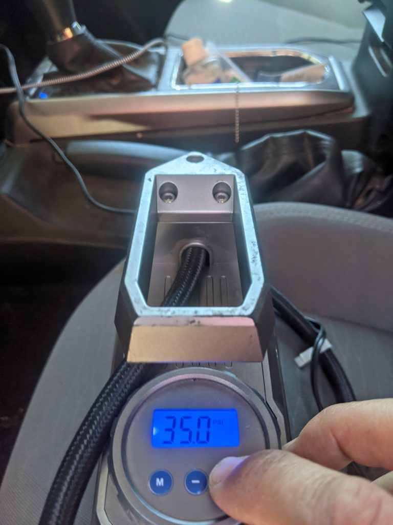 I pulled out the emergency air compressor, hooked it up to the car’s accessory adapter, started up the truck, hooked up the compressor to the tire, and the digital display confirmed the tire was rather low at 9 PSI. So I set the compressor to 35 PSI and turned it on.