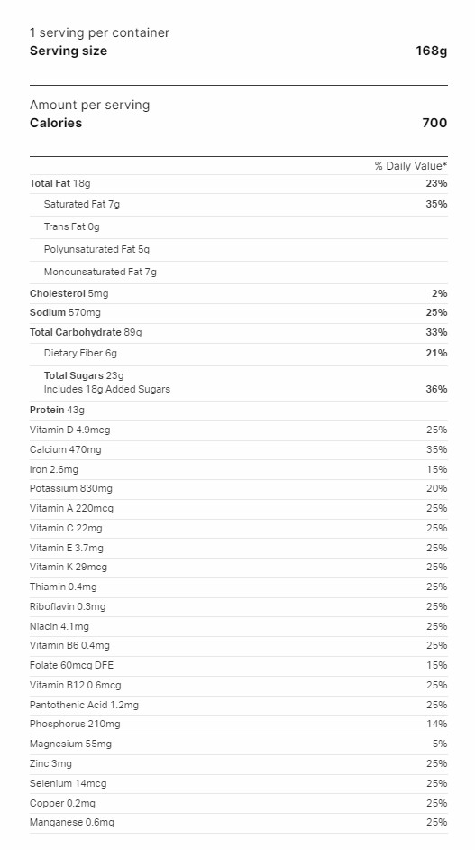 But then we looked at the nutrition and noticed the 700 calories in a just under 6 oz / 168 oz package and with a mix of roughly 89g carbs for quick energy, 18g of fats for sustained energy, and a whopping 43 grams of protein (that’s the same as 8 oz of chicken breast for comparison.) And fortified with many vitamins to boot.