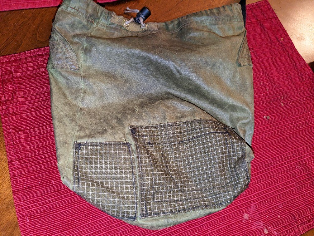 It’s constructed of nylon from an old rain jacket, scrap robic patches (repair and reinforcement), and a simple webbing and buckle system with the company’s typical attention to detail.