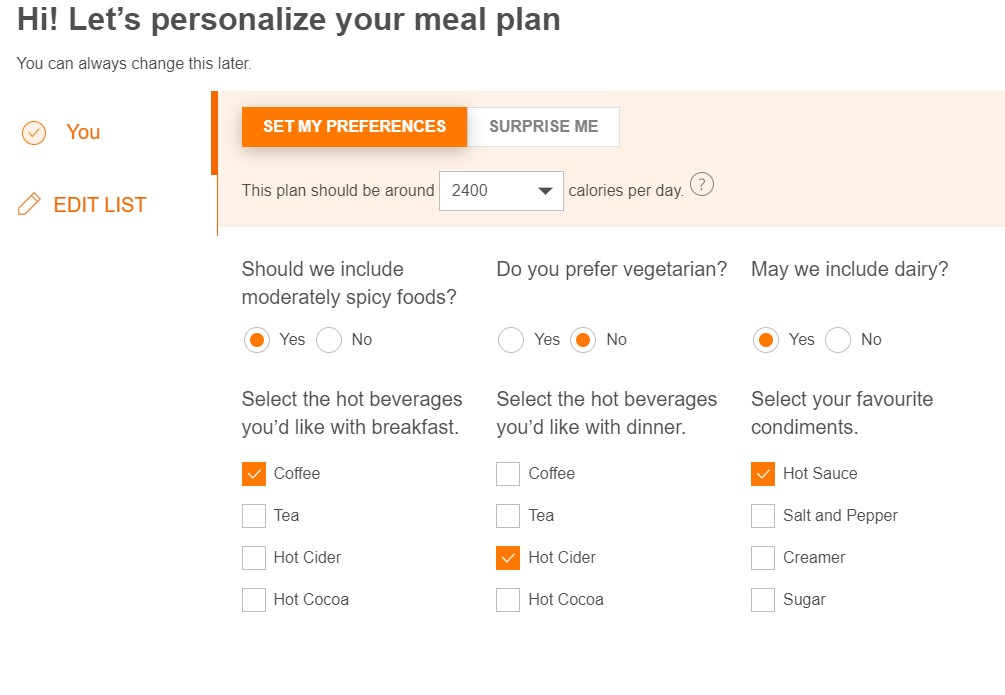 And once you select the days and preferences, the UI gives you all the food in an easy-to-see form that you can customize.