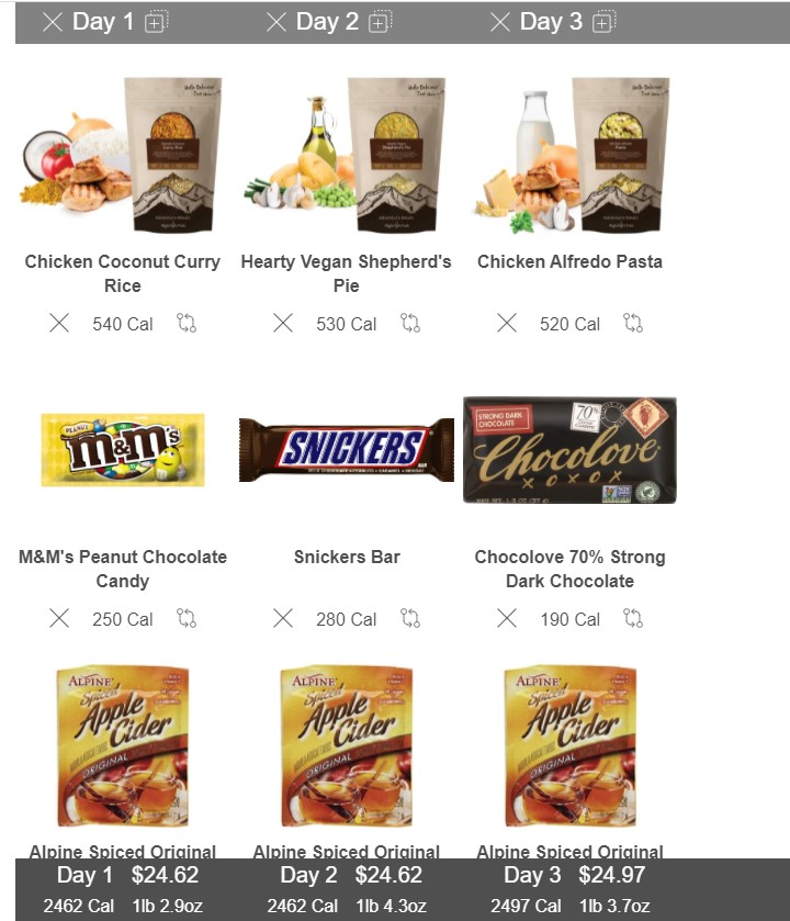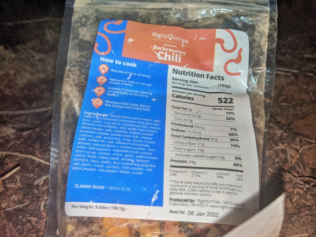 But how is the food itself? The snacks/lunches show the market that this type of plan appeals to, overall. The snacks and lunches provided remind me of what you’d find in Costco or Trader Joe’s, with a few hiker favorites such as Snicker bars thrown in for good measure. Tasty food overall and of good quality. I found the dinners yummy and taste like “real” food. I enjoyed the stew and chili dishes in particular.