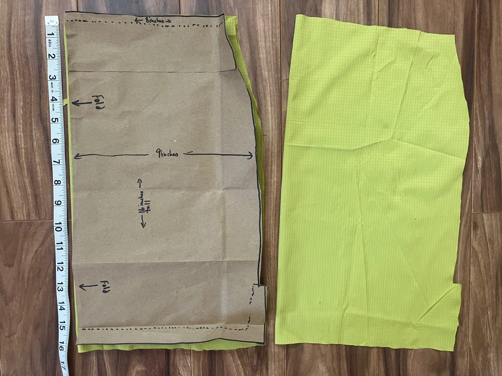 - Cut two on a fold of the lightweight pants material. I tapered the bottom part that attaches around the ankles (shown at the top of the photo).