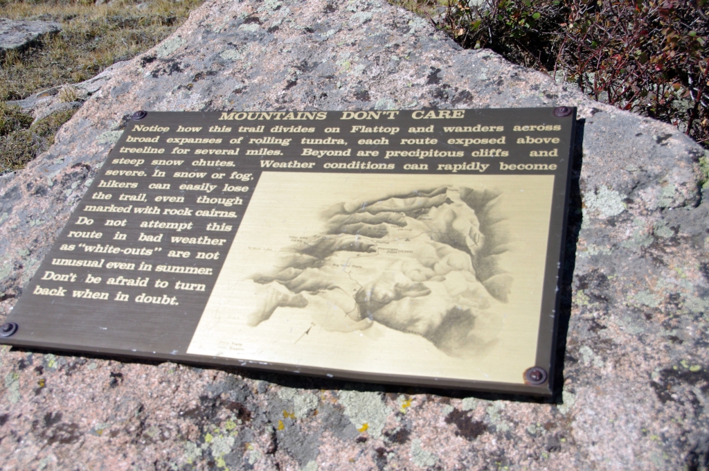- The mountains still don’t care!!! You’ll find this sign twice at either end, by trail, of Flattop Mtn.