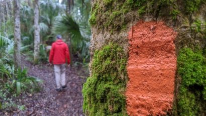 A properly attired hiker: Blaze orange in hunting season